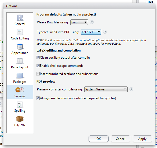 Tools → Global Options… から、左メニューのSweaveを開きます。これは新しくR Markdownを作成するときのデフォルト値になります。
