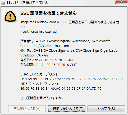 安定版3.3.0でSSLを使用して受信したときに起こった問題です。証明書の有効期限は2016年なのに「certificate has expired」と表示されます。一時的に受け入れるで送受信を続行できますが 常に受け入れるが選択できず、起動の度に同じ警告が出てきます。
