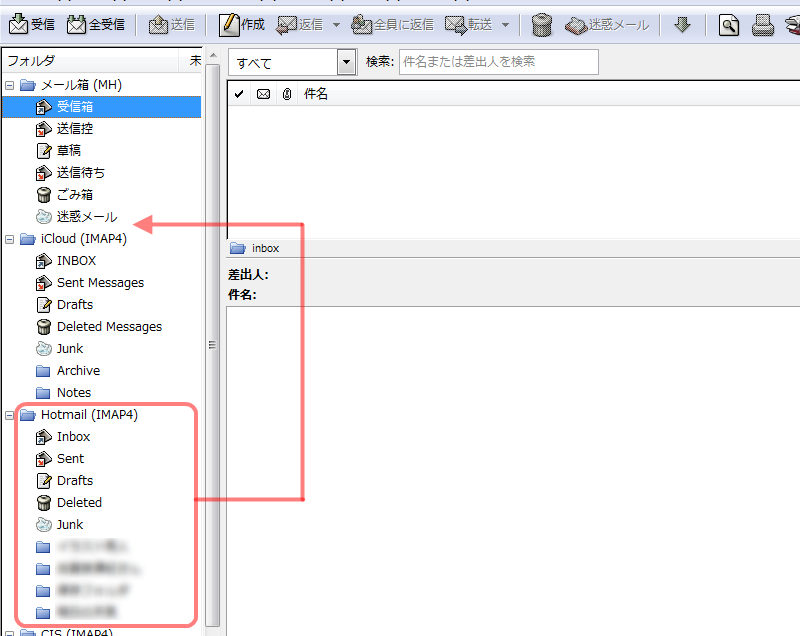 上の画面で iCloud と Hotmail の並び順を入れ替えてみましょう。Sylpheedを終了させ、`folderlist.xml` で `name="Hotmail"` のあるノードを探してカットし、希望の位置に挿入します。